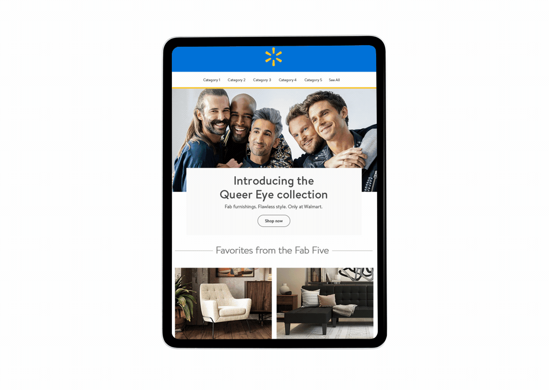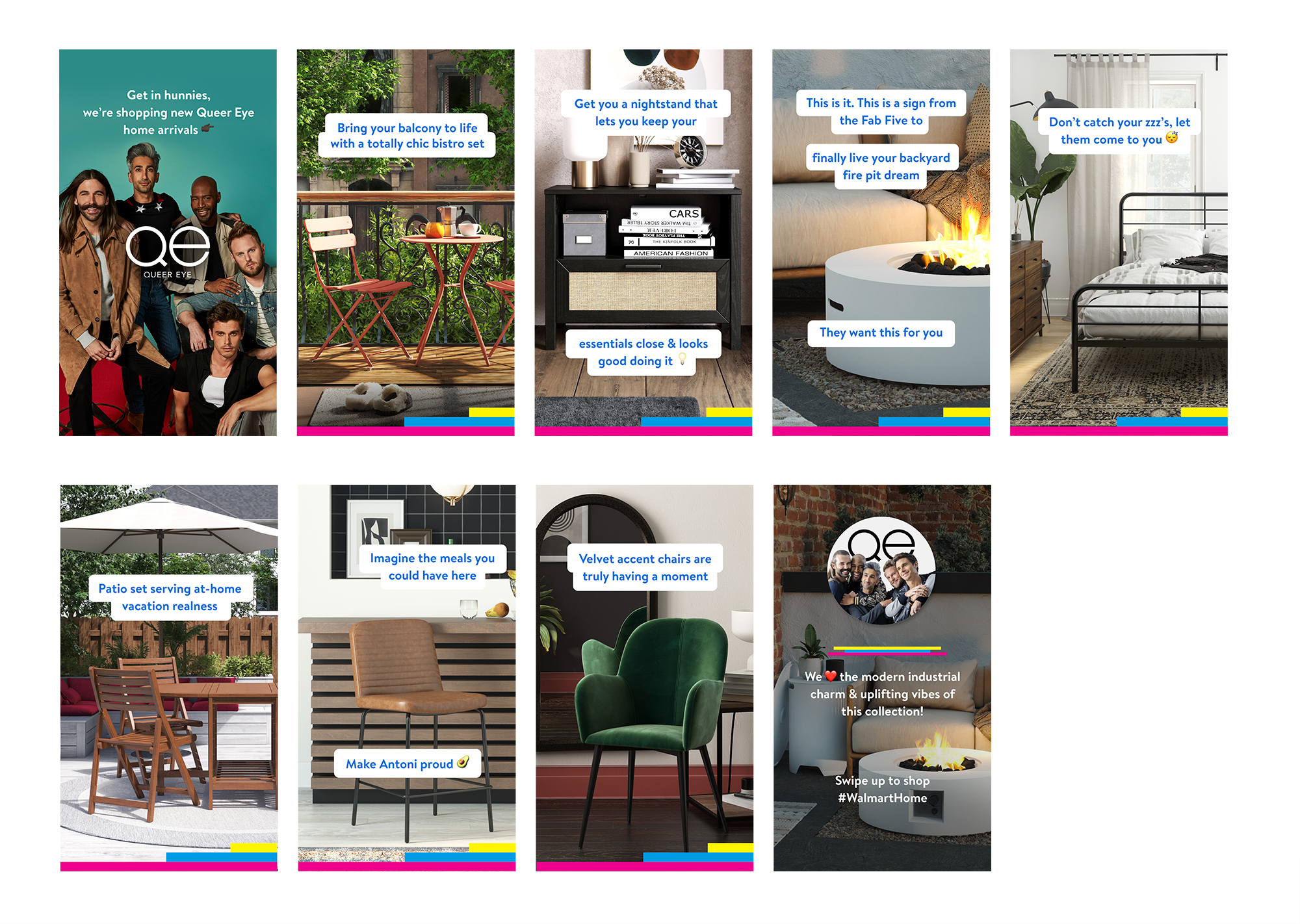 The guys from the TV show Queer Eye teamed up with Walmart to launch a new line of modern home furnishings. I developed a shop-able landing page, and social & marketing assets to coincide with it.